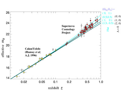 (Let op: op de horizontale as de roodverschuiving en op de verticale de afstand)