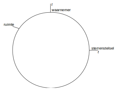 Aan de bovenzijde -maar dat kan op elk willekeurig punt in de ruimte en dus op de cirkel- staat een waarnemer afgebeeld. Deze zal een ster op de rand van het zichtbare heelal -een kwart cirkel verder (of terug)- waarnemen met een roodverschuiving gelijk aan de roodverschuiving die een ster geeft die met de 300.000 km/s van ons af beweegt (limietgeval). [12] Elk punt tussen de waarnemer en het stelsel aan de horizon heeft een dimensie tijd die afhankelijk van de afstand met de waarnemer tussen 0 en 90 graden is geroteerd.