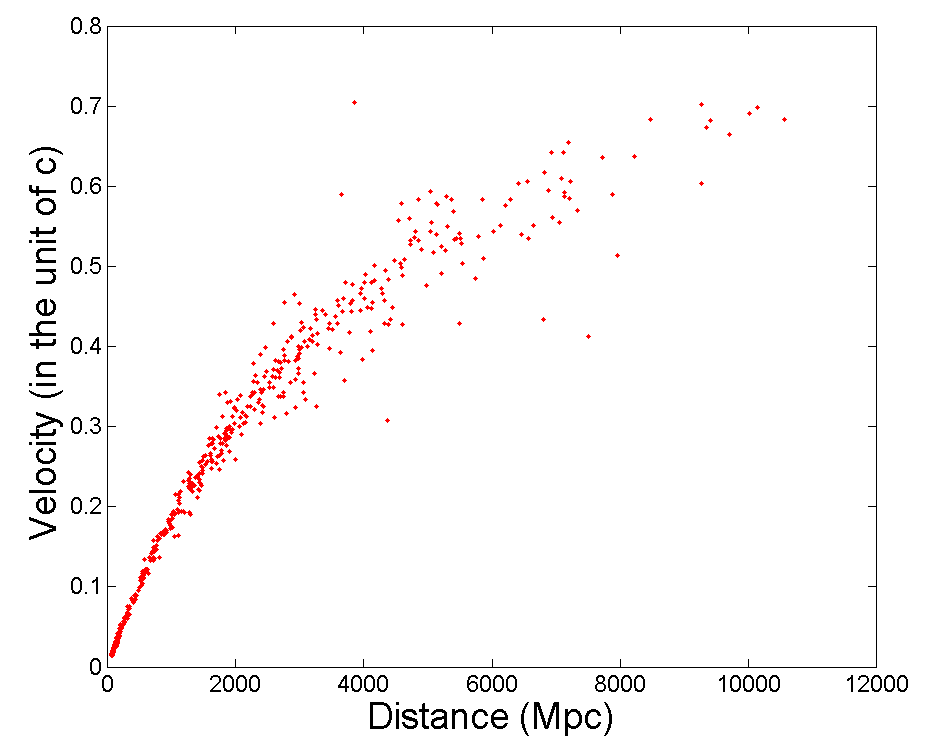 Als we dat vergelijken met de meetresultaten die door anderen zijn gedaan dan geeft mijn voorstelling een betere fit van de data dan een lineair verband, althans in de meetresultaten die ik heb geleend van http://wiki.fok.nl/index.php/Kosmologie .